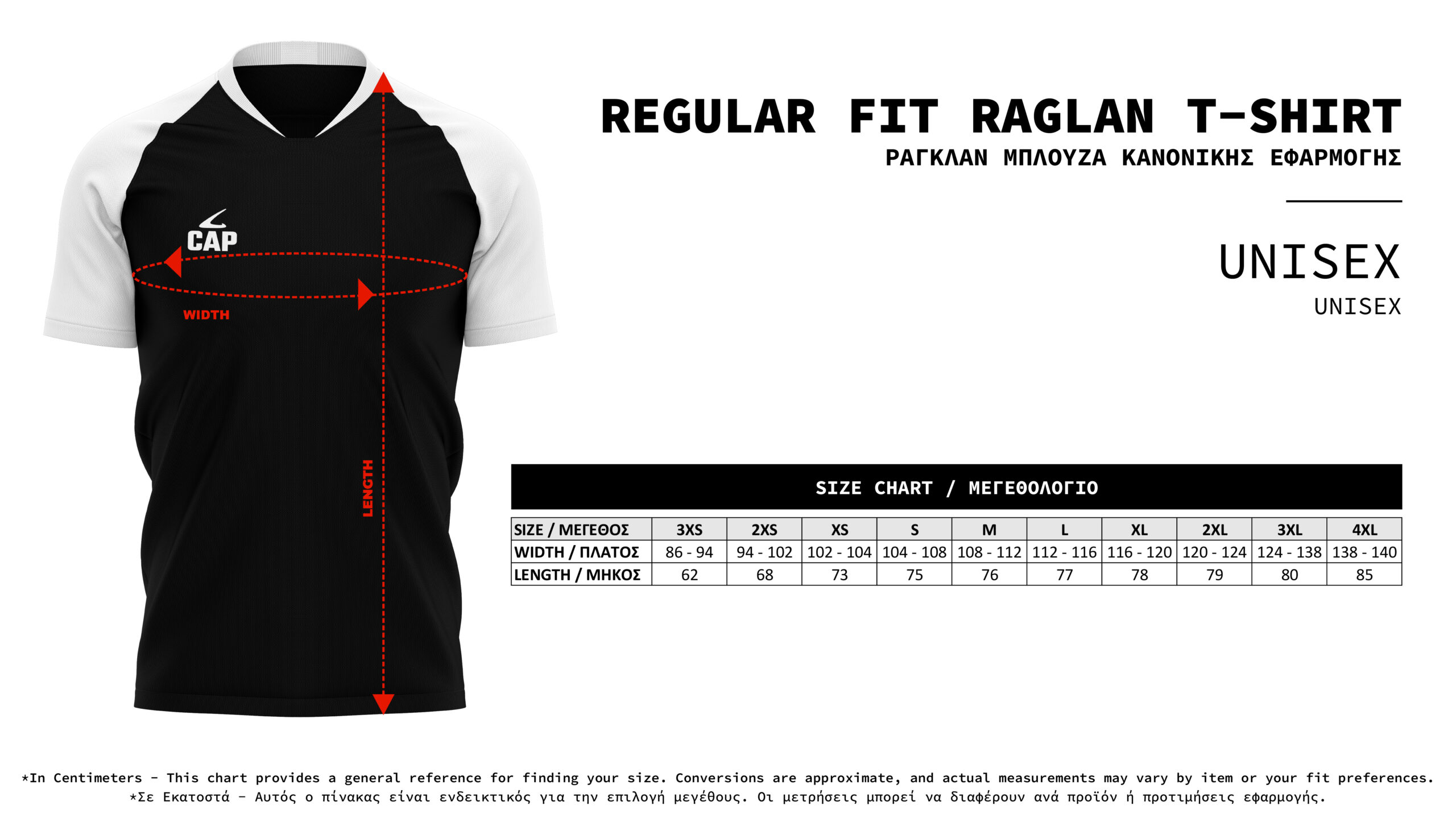 REGULAR FIT UNISEX RAGLAN T-SHIRT – SIZE CHART